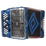 Acordeón de botones, tono de Sol, 31 botones, 12 bajos, de celuloide, parrilla original de acero inoxidable, diapasón con botones aperlados y diseño original, correas de tela y estuche de aluminio.