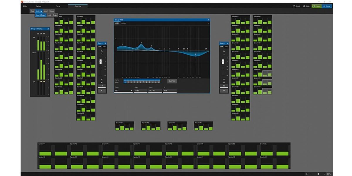 Filtros FIR, retardo de salida de limitadores de audio por canal, GEQ de 31 bandas por canal, PEQ por canal, impedancia de carga.