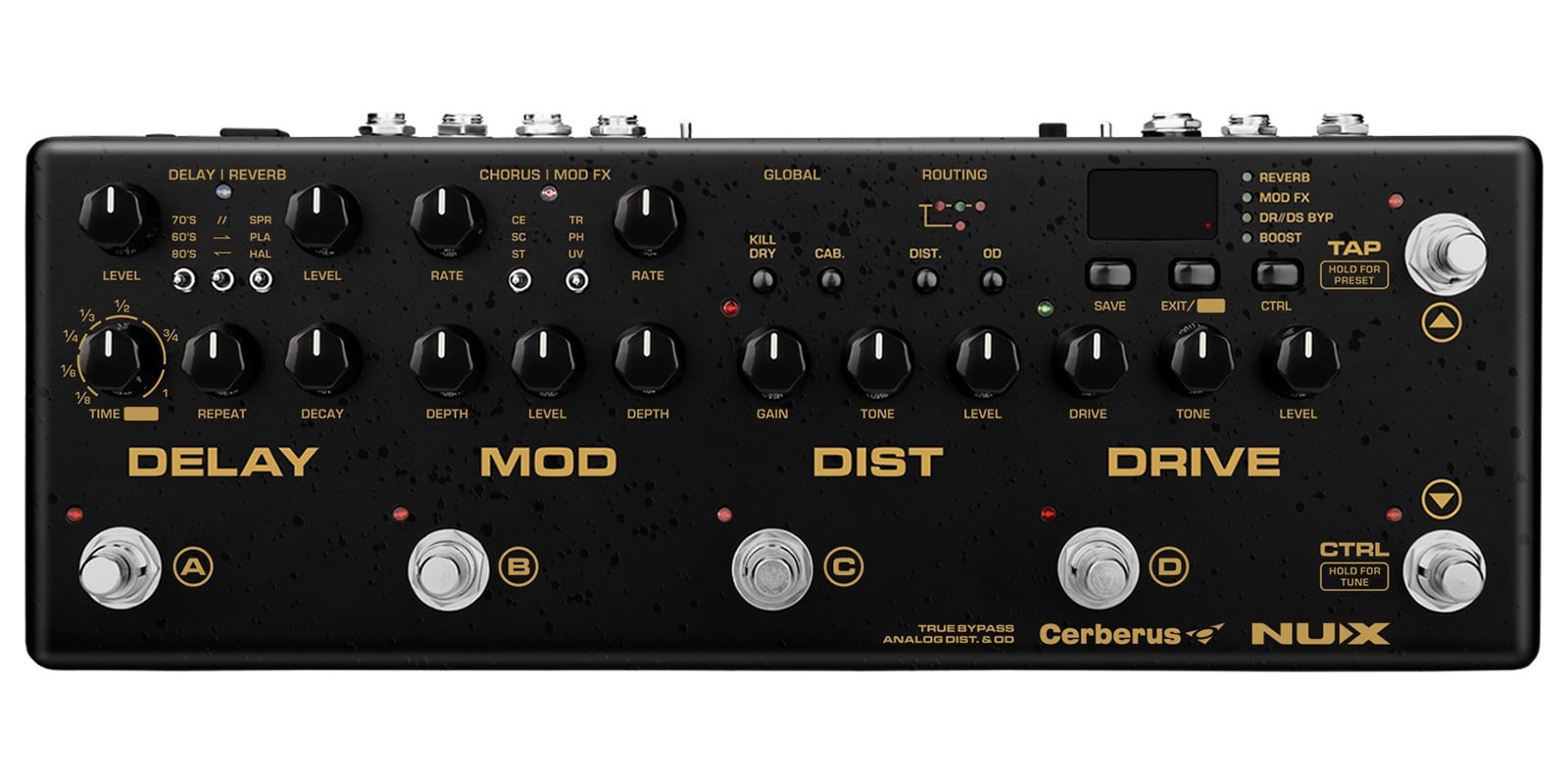 Incluye controles de ganancia, tono y nivel con un botón de encendido.
