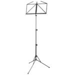 Atril de partituras trípode, plegable y compacto con dos retenedores de página a los lados.