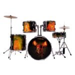El set incluye 2 toms de aire, 1 tom de piso, tarola con atril, bombo, pedal de bombo, atril de platillo, atril de contratiempos, 1 platillo de 16″ pulgadas y un juego de contratiempos de 14″ pulgadas.