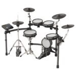 3 toms (doble zona), tarola (triple zona, parche, aro, rimshot), hi-hats (doble zona), crash (doble zona), ride (triple zona: normal, borde, campana), bombo (una zona).