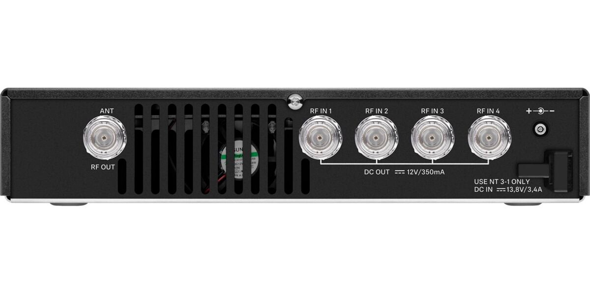 Combinador activo de antena con distribución de energía DC para transmisores IEM con fuente de alimentación, diseñado para su uso con transmisores IEM (In Ear Monitor), incluye una fuente de alimentación NT 3-1-US y cuatro cables BNC.