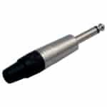 Conector jack mono macho TS de 1/4” (6.3 mm), de metal, conector profesional para instrumento, parcheo o bafle, carcasa de aluminio niquelado y boquilla de PVCde 7.5 mm con rosca. Empaque con 30 piezas.