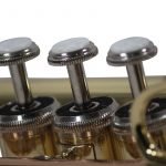 Corneta, afinación en Bb, 3 válvulas de pistón de acero inoxidable, tubería de latón rosado y campana, gancho de pulgar en primer válvula, anillo fijo en tercer válvula, dos llaves de drenado, campana de 124.9 mm, orificios de 11.81 mm, incluye boquilla y estuche ligero de lona.