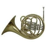 Corno en tonalidad F, campana y cuerpo de latón, tudel de latón dorado, 3 pistones, mecanismo de cuerda, varas exteriores en alpaca, incluye estuche ligero conforma y sistema de mochila.