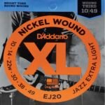 EJ20, el juego para jazz de calibre más liviano de D’Addario, ofrece una tercera cuerda entorchada para Sol que proporciona mayor resonancia y una sensación más tensa mientras conserva gran parte de la facilidad de uso de los juegos de calibre más liviano.
