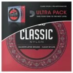 Paquete de encordaduras EJ27N y EJ45TT para guitarra clásica, la encordadura EJ27N es de tensión normal, excelentes para principiantes, estudiantes y profesionales, contiene 3 agudos de nylon transparente y 3 graves entorchados en cobre y recubiertos en plata, tono cálido, con proyección y durabilidad, calidez y proyección, sin terminación de bola, paquete ecológico y resistente a la corrosión para conservar la frescura de las cuerdas, calibres:.0290 – .0450, la encordadura EJ45TT es de tensión normal, cuenta con agudos de titanio, material de multifilamentos trenzados para el núcleo, que utiliza una técnica revolucionaria de devanado, tono único y contemporáneo, estabilidad de afinación y consistencia mejorada, tono brillante y con proyección, núcleo de material compuesto flexible para un mayor potencial de proyección y un tono pleno y redondo, calibres: .0280 – .044.