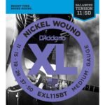 Los juegos para guitarra eléctrica con tensión equilibrada EXL115BT de D’Addario están compuestos por combinaciones de calibres de cuerda matemáticamente optimizados, lo que resulta en un mayor control y comodidad de uso. Combinado con el tono billante característico de las cuerdas con entorchado en níquel XL, cada juego ofrece un mayor control dinámico y una sensación más consistente entre las cuerdas para brindar equilibrio entre estirada, rasgueo, trasteo, uso de púa, punteo y percusión (slap).
