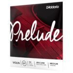 Juego de cuerdas para violín, serie Prelude de D’Addario, escala 3/4, tensión media, aptas para violines de 3/4 con una longitud de 12 1/4″ pulgadas (310 mm), núcleo de acero sólido, inalteradas por los cambios de temperatura y humedad, excelente respuesta del arco, tono cálido y durable, paquete ecológico y resistente a la corrosión para conservar la frescura de las cuerdas.