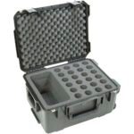 El 3I-2015-MC24 de SKB es un estuche para micrófonos, puede guardar hasta 24 micrófonos de forma vertical y puede dar cabida a a los micrófonos de condensador más largos. Este estuche incluye un gran compartimento acolchado para accesorios y almacenamiento de cables, clips de micrófono u otros elementos escenciales para microfonía. La serie 3i de estuches moldeados por inyección y a prueba de agua están construidos con resina de copolímero de polipropileno de ultra alta resistencia y presentan un diseño con juntas, resistente al agua y al aire, sumergible (IP67) y es resistente a la corrosión y a los daños por impactos. Cuenta con una bisagra moldeada continua, sistema de cerradura “trigger release” patentado, cómodo mango de sujeción sobre moldeado, apilamiento seguro y una valvula compensadora de presión ambiental automática (MIL-STD-648C), lo que contribuye a su diseño de grado militar. El interior de espuma se corta en la nueva máquina de agua a chorro de SKB que se utiliza para cortar la espuma de forma personalizada y diseñar nuevos productos. Es estuche tiene espuma entrelazada en la tapa para un mejor ajuste.