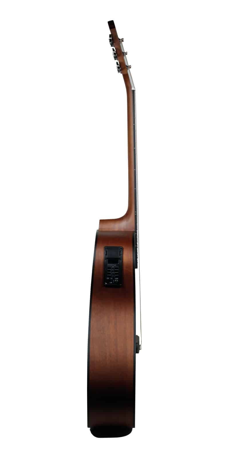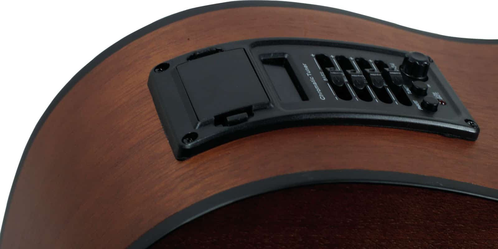 Guitarra electroacústica tipo texana, tapa de abeto, aros, fondo y brazo de caoba, puente de sonokelin y diapasón de rosewood, resaque, mica, 20 trastes, maquinaria de acero die-cast, preamp activo KLT-34 con afinador digital, ecualizador de 4 bandas, volumen y fase, equipada con cuerdas D’Addario. Dimensiones del producto: 109 x 49 x 14 cm. Peso: 3.15 Kg.
