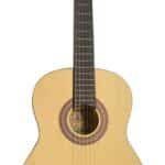 Guitarra acústica con cuerpo de linden laminado, aros y fondo de linden laminado, puente de palo de rosa, brazo de maple, alma totalmente ajustable, cejuela deébano, diapasón de maple, maquinaria cromada, cuerdas de nylon, escala 650 mm, 19 trastes, incluye funda de transporte, afinador de silbato y plumillas.