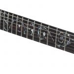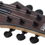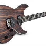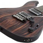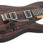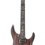 Guitarra eléctrica sólida, cuerpo de caoba, tapa arqueada de ébano, hardware negro y cromado, construcción bolt-on, unión en multicapa, negra, puente: trémolo Wilkinson WVS50IIK, maquinaria Schecter Locking, brazo en forma de C delgado de maple tostado y purpleheart multicapa con varillas de refuerzo de fibra de carbono, diapasón de ébano de 14″ (355 mm) de radio, 24 trastes X-Jumbo, incrustaciones de abalone y pearloid: Vine of Life, escala: 25.5” (648 mm), espesor en el primer traste: .787” (20 mm) y en el traste 12: .866” (22 mm), cejuela de Graph Tech XL Black Tusq de 1.653” (42 mm) de ancho, alma ajustable de dos vías con tuerca Allen de 5/32” (4 mm), controles: volumen, switch toggle coil split de 2 vías, tono y selector de 3 vías, pastilla del puente: Schecter Diamond ’78 Special, pastilla del brazo: Schecter Diamond ’78, perillas de velocidad de punta de agarre.