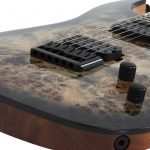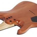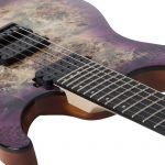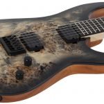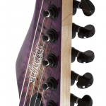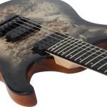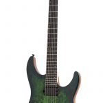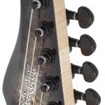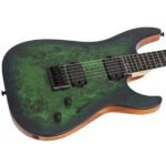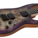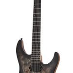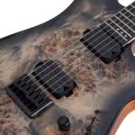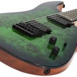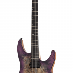 Guitarra eléctrica sólida, cuerpo de caoba, tapa burl, hardware negro, construcción bolt-on, unión: una capa negro, puente Schecter Custom Hardtail con String Thru Body, maquinaria Schecter, diapasón de Wenge, brazo C ultra delgado de 3 piezas de maple con varillas de refuerzo de fibra de carbono, incrustaciones pearloid offset y puntos inversos, escala: 25.5” (648 mm), 24 trastes X-Jumbo, cejuela de Graph Tech XL Black Tusq de 1.653” (42 mm) de ancho, alma ajustable de 2 vías con tuerca Allen 5/32” (4 mm), un volumen (Push-Pull), un tono y selector de 3 posiciones, pastilla del puente: Schecter Diamond Decimator, pastilla del brazo: Schecter Diamond Decimator, perillas de metal moleteado con tornillo de ajuste.