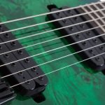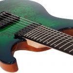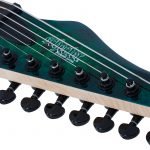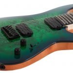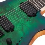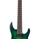 Guitarra eléctrica sólida de 7 cuerdas, cuerpo de caoba, tapa burl, hardware negro, construcción bolt-on, unión: una capa negro, puente Schecter Custom Hardtail con String Thru Body, maquinaria Schecter, diapasón de Wenge, brazo C ultra delgado de 3 piezas de maple con varillas de refuerzo de fibra de carbono, incrustaciones pearloid offset y puntos inversos, escala: 26.5” (673 mm), 24 trastes X-Jumbo, cejuela Graph Tech XL Black Tusq de 1.889” (48 mm) de ancho, alma ajustable de 2 vías con tuerca Allen 5/32” (4 mm), un volumen (Push-Pull), un tono y selector de 3 posiciones, pastilla del puente: Schecter Diamond Decimator, pastilla del brazo: Schecter Diamond Decimator, perillas de metal moleteado con tornillo de ajuste.