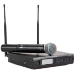 Sistema inalámbrico, rango de frecuencias disponibles: 638 – 662 Mhz, 606 – 630MHz, 863 – 865 MHz, rango de 50 metros, respuesta de frecuencia: 50 Hz – 15 kHz, relación señal a ruido: -105 dB, 99 canales seleccionables, antena diversity,hasta 5 sistemas utilizables en la misma ubicación, búsqueda automática de canales, IR sync, estuche de ABS.