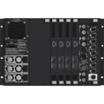 Unidad central de procesamiento para sistema PROX con procesamiento de señal digital de 108 Gigaflops, router HyperMAC con 192 canales bidireccionales sobre cobre y fibra óptica, procesamiento de punto flotante de 40 bits con frecuencia de muestreo de 96 kHz, conexión redundante dual al centro de control para mayor confiabilidad, conexiones de snake de hasta 500 metros con fibra óptica o 100 metros con cable CAT575e, equipado con 4 tarjetas DSP como estándar para operación redundante N+1, ranura de expansión de tarjeta para opciones adicionales de conectividad, cuenta con Neutrik etherCON* AES50 y control puertos de control de red Ethernet, conector fibra-dual Neutrik opticalCON DUO utilizado para la conexión de snake de fibra óptica, chasis montable en rack de 7 unidades para mayor durabilidad en aplicaciones portátiles, fuente de alimentación universal de conmutación automática de 3 bahías con redundancia N+1, dimensiones: 309.9 x 483 x 375 mm, peso: 24 kg.