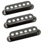 Con más del doble de la potencia de una Stratocaster single-coil tradicional, las pastillas Quarter Pound transformarán cualquier Strato en una bestia gruñona y te brindarán un tono gordo y contundente con mucho brillo en el top-end. Estas pastillas Strato de alta salida te darán acordes robustos y las notas individuales saltarán de una manera que ninguna otra pastilla puede ofrecer. Los imanes de alnico 5 de 1/4″ de diámetro pulidos a mano individualmente, ayudan a darle un montón de brillo high-end y los armónicos de rango medio superior que hacen que esta pastilla sea tan especial. La pastilla al centro es RW/RP para un funcionamiento silencioso en las posiciones 2 y 4. Las pastillas del brazo/puente y del centro también están disponibles en una variación de tapping opcional, lo que te permite aprovechar las tonalidades vintage y de alta salida con un solo set. Estas bobinas se construyen a mano, se sumergen en laca, luego se bobinan y se enceran para obtener un rendimiento sin chirridos. Utilizamos un diseño plano de Forbon “ovalado” moderno (no triangular) que permite que las pastillas Strat Quarter Pound de alta salida encajen en cualquier guitarra enrutada hacia single-coils. Los modelos de brazo/centro/puente tendrán la misma salida, dirección de bobinado y polaridad magnética. La posición RwRP central (bobinado inverso / polaridad inversa), elije esta opción para tener una pastilla que cancele el zumbido con uno de nuestros modelos de brazo o puente. Todos los sets, excepto el modelo exclusivo de Jimi Hendrix, vienen con un RWRP central como pastilla central. Tapped: Los modelos de alto rendimiento pueden tener una opción de “tap” disponible. Se coloca un cable conductor adicional a la mitad del bobinado, lo que permite el cableado a un potenciómetro push-pull o un mini switch de palanca para brindar una opción de nivel de salida vintage adicional.