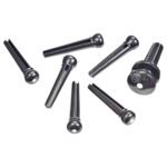 Juego de pernos moldeados por inyección con terminación para puente, color ébano con punto de marfil, fabricados en termoplástico ABS de alta calidad y sirven como repuesto para cualquier guitarra acústica, resistencia y durabilidad, mejora el tono y la apariencia de cualquier guitarra acústica, poseen un estrechamiento de 5 grados, se incluye un perno para puente adicional.