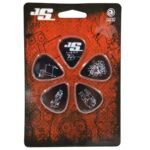 Las púas de la serie JS están fabricadas en celuloide de máxima calidad y se encuentran disponibles en color blanco con impresión en negro o en color negro con impresión en plateado. Cada paquete de 10 púas incluye una púa de cada uno de los 10 diseños originales de Joe Satriani.