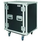 Estuche de rack profesional de 19″ pulgadas para 16 unidades con 4 ruedas de 100 mm de grado industrial (2 con freno).