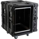 Rack de 14 espacios, sistema de bisagras compuesto y reemplazable, rieles roscados de acero, rieles traseros, resistente a choques y al agua, puerta con juntas, válvula de alivio de presión, ruedas removibles de 4.5″, pestillos empotrados, roto moldeado, ancho interior: 48.26 cm, altura interior: 62.23 cm, profundidad exterior: 91.44 cm, ancho exterior: 67.95 cm, altura exterior: 86.36 cm, peso: 42.71 kg.