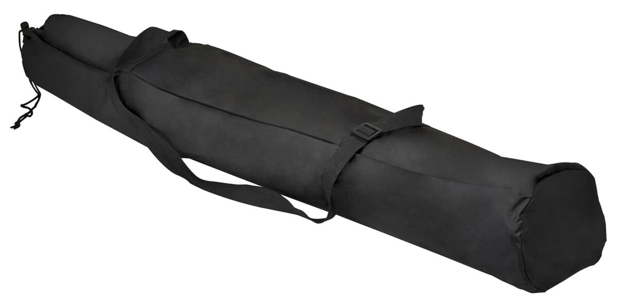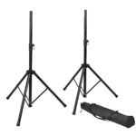 Juego de dos soportes de altavoz con base trípode con perilla giratoria de altura ajustable, pasador de seguridad y patas de goma, terminado con recubrimiento en polvo negro, construcción de resistentes tubos de metal, altura mínima: 120 mm, altura máxima: 177 mm, ancho externo: 13.3 mm, peso: 8 kg.