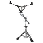 Atril para tarola, con boom para ajuste de altura e inclinación, tres puntos de agarre, mecanismo de inclinación, patas de doble solera con gomas para evitar deslizamientos, gomas enlos puntos de sujeción, sistema de tensión por medio de rueda, un ajuste de altura, mariposas metálicas sencillas, terminado cromado, estable y seguro.