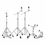 Juego de hardware de la serie 2000, incluye un soporte de contratiempos HH 2000, un soporte de tarola SS 2000, 2 soportes de platillo con mino boom MBS 2000 V2 y un pedal de bombo SP 2000, terminado cromado.