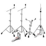Un soporte de contratiempos HH 400, un soporte de tarola SS 4000, 2 soportes para platillo con mini boom MBS 4000 y un pedal SP 4000 para bombo.