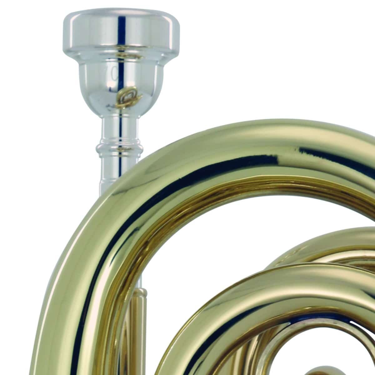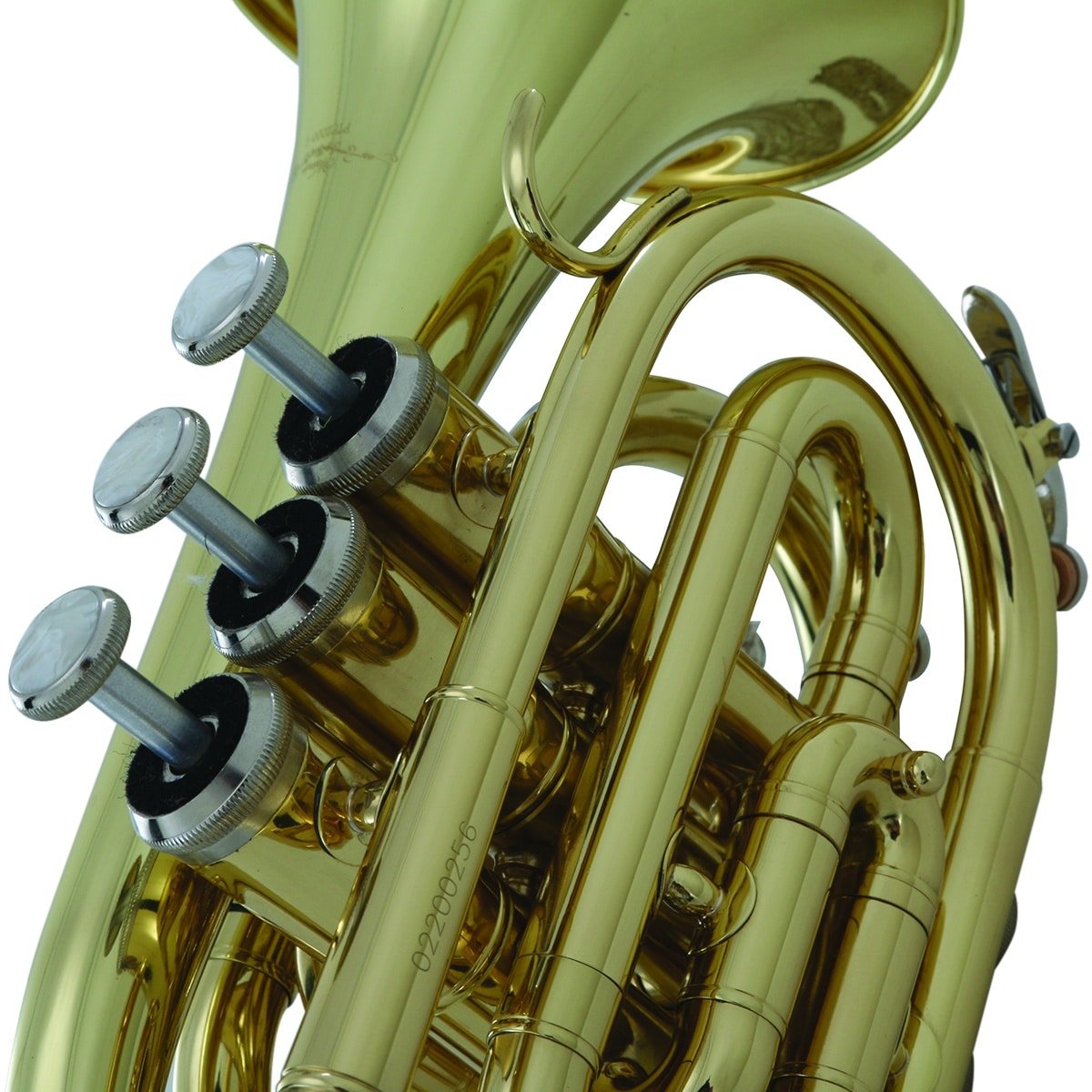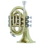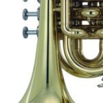 Trompeta de mano en Bb, acabado de latón laqueado, válvulas de acero inoxidable, dos llaves de drenado, campana de 123 mm, orificios de 11.81 mm, incluye boquilla y estuche de lona.