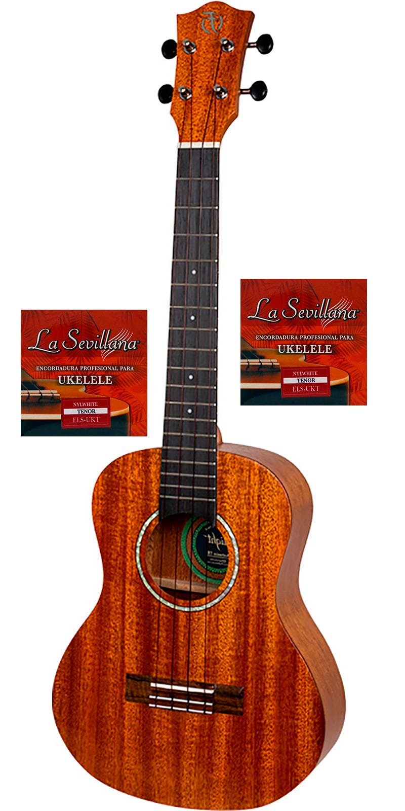 Ukelele electro acústico tenor, tapa de caoba sólida, aros y fondo de caoba laminada, puente de madera púrpura, brazo de okoume, diapasón de madera púrpura, cejuela y montura de hueso, ancho de la cejuela: 35 mm, 18 trastes, marcadores de posición en los trastes 5, 7, 10 y 12, roseta perla, puntos laterales, pastilla activa con controles de tono, incluye funda acolchada y un paquete de stickers, incluye 2 sets de cuerdas ELS-UKT de La Sevillana para ukelele tenor.