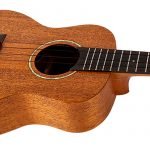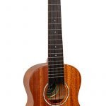 Ukelele concierto, tapa de caoba sólida, aros y fondo de caoba laminada, puente de madera púrpura, brazo de okoume, diapasón de madera púrpura, cejuela y montura de hueso, ancho de la cejuela: 35 mm, 18 trastes, pastilla activa con controles de tono, marcadores de posición en los trastes 5, 7, 10 y 12, roseta perla, puntos laterales, incluye funda acolchada y un paquete de stickers.