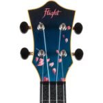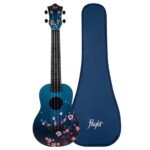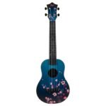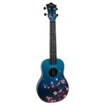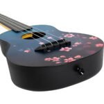 Ukelele concierto, tapa de tilo laminado, aros y fondo de ABS, 17 trastes (14 al cuerpo), puente de ABS, diseño de flor de cerezo (sakura), botón de tahalí, brazo, diapasón, cejuela y montura de ABS, ancho de la cejuela de 36.6 mm, marcadores de posición en los trastes 5, 7, 10 y 12, traste cero, tapa de madera, espalda arqueada, afinadores de engranaje abiertos, puntos laterales.